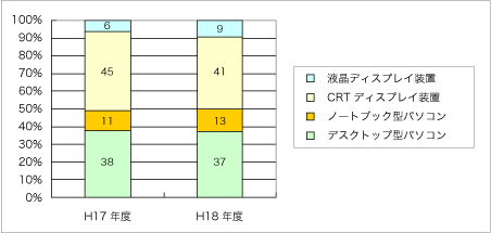 なお回収台数のカテゴリー別内訳はCRTディスプレイ装置が41%、デスクトップ型パソコンが37%と多く、ノートブック型パソコンは13%、液晶ディスプレイ装置は9%となっています。また前年度比でカテゴリー別構成比の変化を見ると、平成18年度は平成17年度と比較して、ノートブック型パソコンが+2%(11%→13%)、液晶ディスプレイ装置が+3%(6%→9%)とそれぞれ比率を伸ばしています。