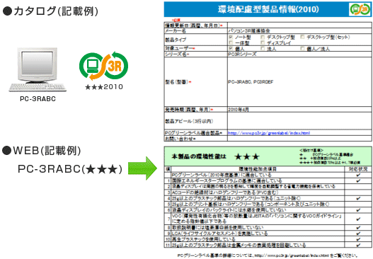 製品審査基準に合格したメーカーは、カタログまたは各社のホームページに適合製品の環境性能レーティング付きのPCグリーンラベルロゴマーク(注4)の表示を行い、さらに各社のホームページで環境配慮型製品情報を公開します。